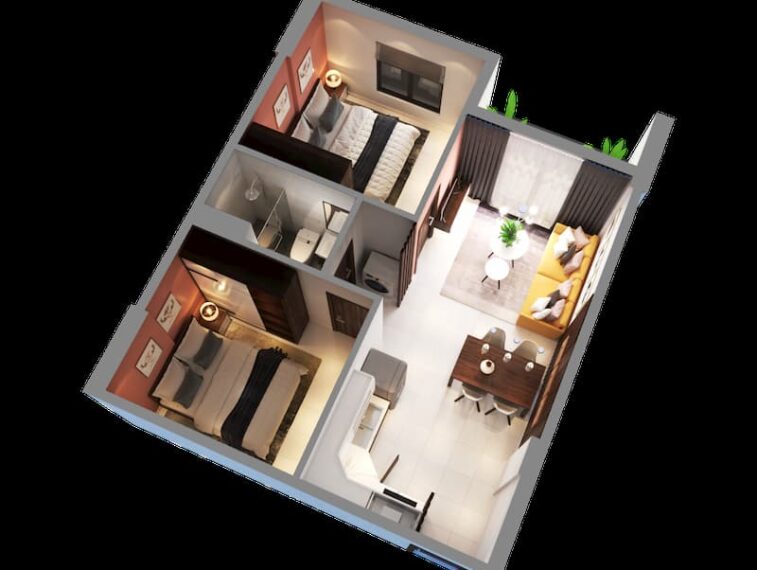 • Diện tích căn hộ: 48m2. Gồm 1 phòng khách, 2 phòng ngủ, 1 nhà vệ sinh, ban công.