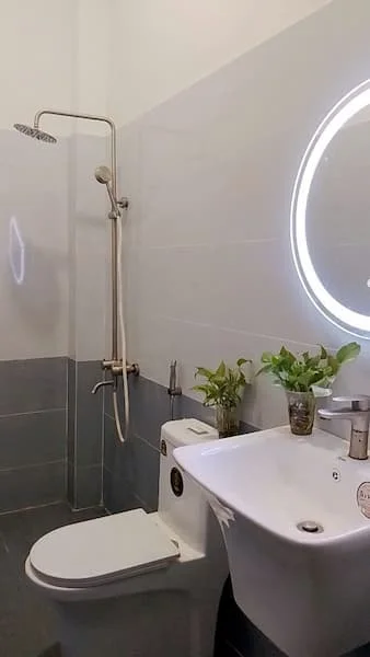 + Nhà vệ sinh: Trang thiết bị hiện đại với gương LED cảm ứng, vòi sen đứng và không gian sạch sẽ.