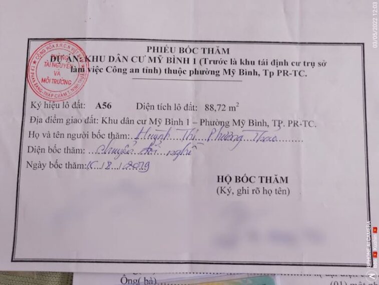 - Pháp lý: Phiếu bốc thăm diện chuyển đổi nghề khu dân cư Mỹ Bình