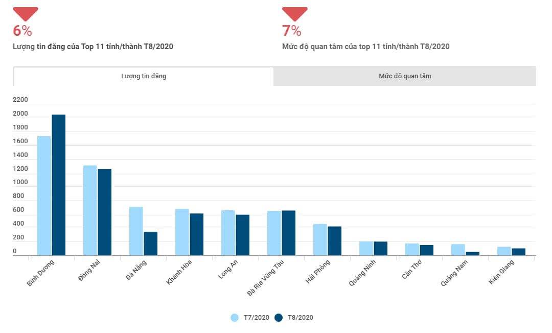 Bên cạnh đó, Bình Dương ghi nhận lượng tin đăng tăng trưởng mạnh (18%) do trong T8/2020 nhiều dự án cao tầng và thấp tầng được đẩy mạnh bán hàng. Hải Phòng và Cần Thơ cũng ghi nhận mức độ quan tâm tăng 9% và 3% so với T7/2020.Bên cạnh đó, Bình Dương ghi nhận lượng tin đăng tăng trưởng mạnh (18%) do trong T8/2020 nhiều dự án cao tầng và thấp tầng được đẩy mạnh bán hàng. Hải Phòng và Cần Thơ cũng ghi nhận mức độ quan tâm tăng 9% và 3% so với T7/2020.