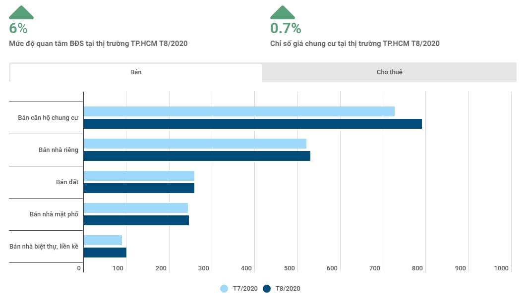 Thị trường TP.HCM ghi nhận mức độ quan tâm tăng trưởng ít hơn thị trường Hà Nội nhưng lượng tin đăng lại giảm nhiều hơn. Trong T8/2020, lượng tin đăng giảm 8% trong khi mức độ quan tâm tăng 6% so với cùng kì tháng trước. Đối với BĐS bán, xu hướng tăng mức độ quan tâm được thể hiện rõ nét nhất ở loại hình “Bán nhà biệt thự, liền kề” (tăng 13%) và “Bán căn hộ chung cư” (tăng 9%). Loại hình BĐS cho thuê cũng ghi nhận sự tăng trưởng mạnh đối với các loại hình “Cho thuê nhà trọ, phòng trọ” (tăng 31%) và “Cho thuê căn hộ chung cư” (tăng 17%). Mức độ quan tâm loại hình “Cho thuê nhà mặt nhà mặt phố” tiếp tục giảm 19% chủ yếu tại Quận 1, Quận 3, Bình Thạnh và Bình Tân. Chỉ số giá chung cư tại TP.HCM T8/2020 ghi nhận tăng nhẹ 0,7% so với tháng trước.
