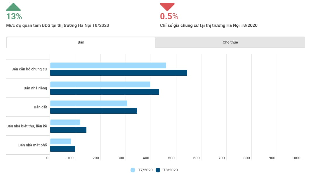 Cụ thể, tại Hà Nội, mức độ quan tâm loại hình BĐS bán tăng 16%, loại hình BĐS cho thuê không biến động. Các loại hình có mức độ tăng trưởng lớn nhất là “Bán nhà biệt thự, liền kề” (tăng 20%), “Bán nhà mặt phố” (tăng 19%) và “Bán căn hộ chung cư” (tăng 18%). Trong T8/2020, thị trường căn hộ chung cư chứng kiến nhiều chủ đầu tư tại Hà Nội tung ra nhiều chương trình khuyến mãi, đặc biệt là những chương trình gia hạn thời gian được hưởng lãi suất ưu đãi. Chỉ số giá chung cư tại Hà Nội T8/2020 ghi nhận giảm 0,5% so với tháng trước.